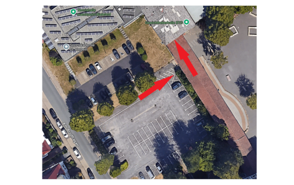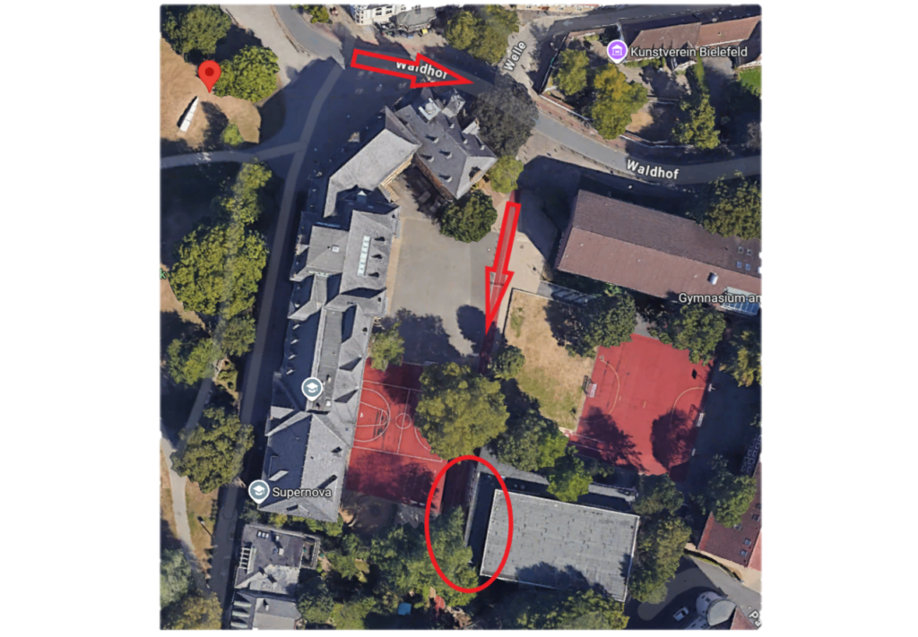 Wenn man vor dem Haupteingang der Kunsthalle steht, begibt man sich nach links in den Kunsthallenpark. Das auffällige Gebäude, das direkt an den Park angrenzt, ist das Ratsgymnasium. Geht man nun links am Gebäude vorbei, erreicht man das Gittertor, welches auf den Schulhof führt. Die Sporthalle kann man dann bereits sehen. Es geht nun geradeaus über die rote „100“-Meterbahn zum Eingang der Sporthalle. Direkt hinter der Glaseingangstür befindet sich das Treppenhaus. Folgt der Treppe bis ganz nach oben. Rechts befindet sich die Halle.